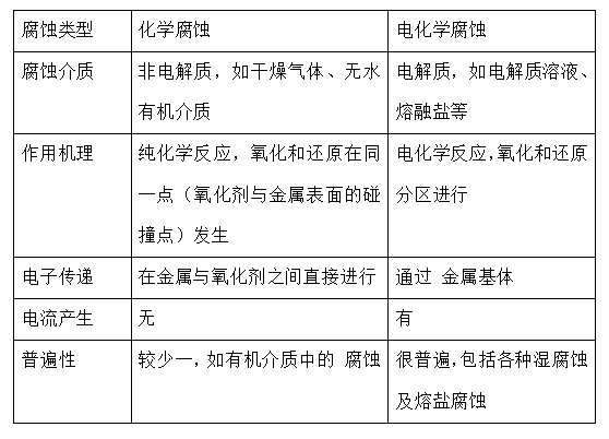 从化学反应类型来看,无论化学腐蚀,还是电化学腐蚀都属于氧化一还原反应,这是两类腐蚀的共同之处。但是,两者间的区别主要是金属和氧化剂之间的作用机理不同,具体可归纳列于表: