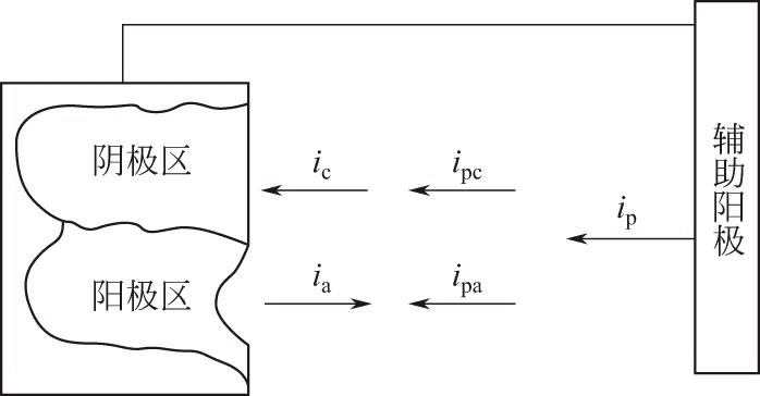 金属在电解质溶液中,由于本身存在的电化学不均匀性或外界环境的不均匀性,会形成腐蚀原电池。在原电池的阳极区发生腐蚀,不断输出电子,同时金属离子溶入液体;阴极区发生阴极反应,视电解液和环境条件不同,在阴极表面上一般会发生吸氧反应或析氢反应。如果给金属通以阴极电流,整个腐蚀原电池的电位将向负的方向偏移,使金属阴极极化,这就可以抑制阳极区金属的电子释放,从而减轻金属腐蚀。如图1所示,当外部电流施加到被腐蚀的金属表面,部分流到阳极区,部分流到阴极区,当施加的电流足够大,以致流进阳极区的电流可以抵消自然腐蚀电流,即ipa≥ia,没有静电流离开金属表面,腐蚀则完全停止。